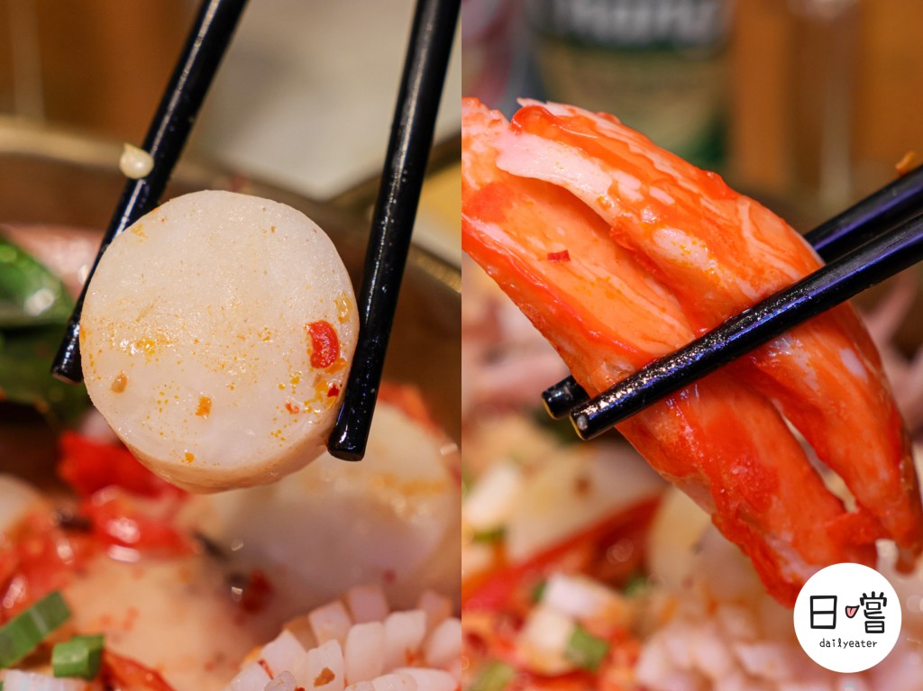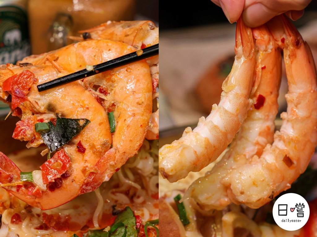 這鍋裡面的蝦我自己滿喜歡的,是那種尺寸不小、肉又厚的蝦,不是點綴型。殼好剝,肉吃起來是脆的,不是粉的,單吃就有甜味。外面裹到的冬蔭辣油跟辣椒碎會先沾在殼上,剝開之後蝦肉反而是清甜的,拿來配湯或配麵都很加分。