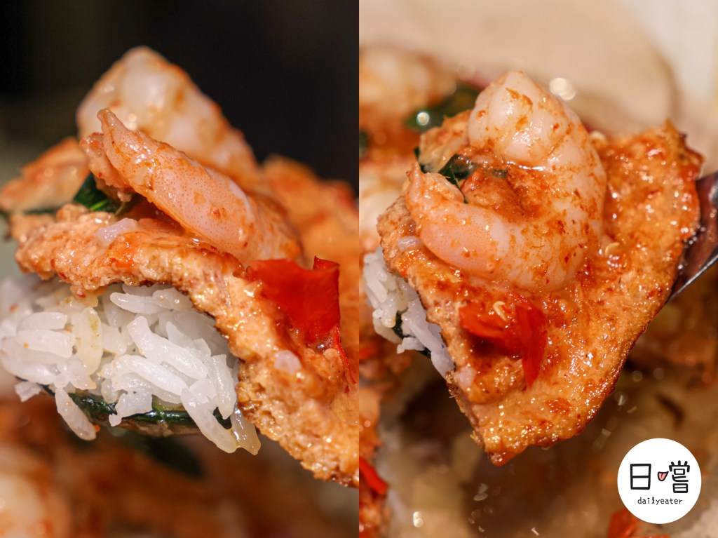 這道「泰式咖哩蝦仁煎蛋蓋飯」算是這餐裡面很有記憶點的一道。老闆娘本身是泰國人,又會三不五時回泰國看現在流行什麼,這道就是泰國街頭很紅的小吃類型。