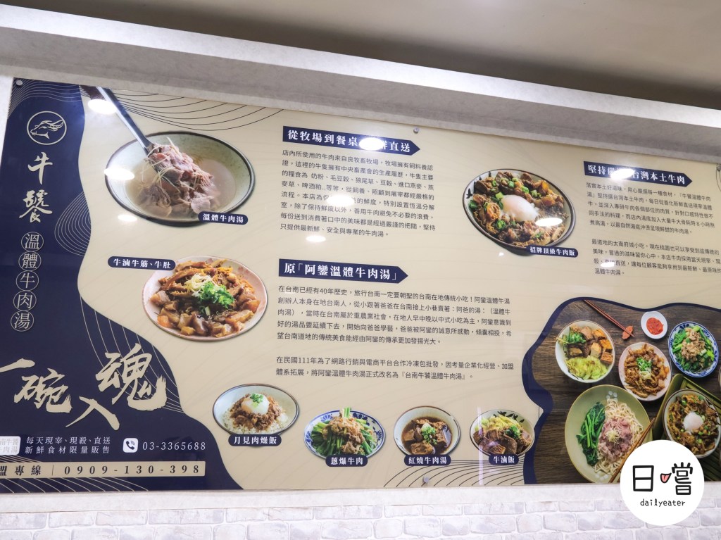 牆面上可以看到店家對品牌背景與食材來源的介紹,主打從牧場到餐桌的概念,並標示堅持使用台灣本土牛肉。整體資訊呈現偏向專門店路線,而不是單純的小吃攤,讓人對他們在食材選擇與製作流程上的用心程度留下第一印象。