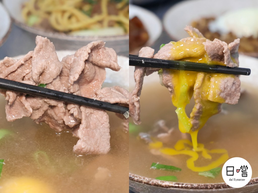 從近拍可以看到牛肉纖維清楚,部分部位帶有筋膜與膠質感,搭配半熟蛋流下來的蛋黃,視覺上會讓人很直覺聯想到拌開後與白飯結合的畫面。蔥花的綠色也讓整碗在大量肉色中多了一個清爽對比。